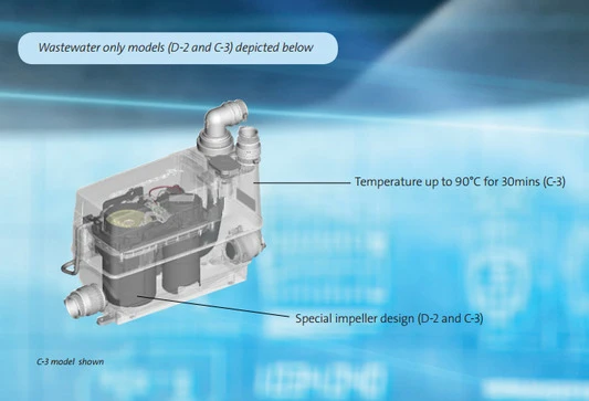 SOLOLIFT2 is a unique range of compact lifting stations enabling drainage of any domestic sanitary appliance wherever needed, independent from the gravity drain system. The units collect and pump the wastewater through a thin pressure pipe (>23mm) to the next down pipe – up to 6m high or 100m distance.